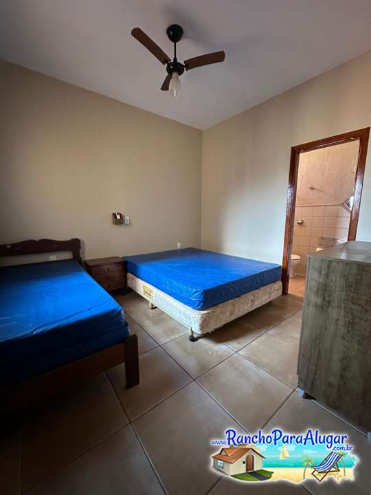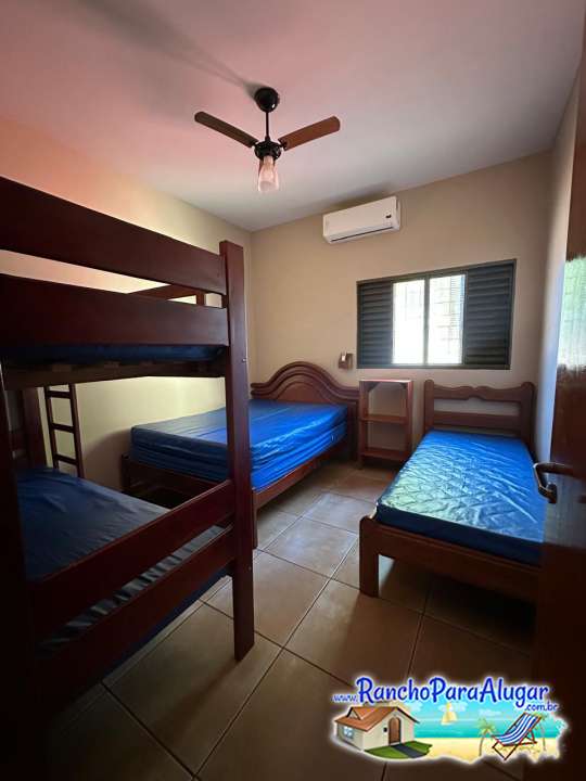 Quarto 1 com uma cama de casal, uma cama de solteiro e um beliche.