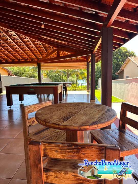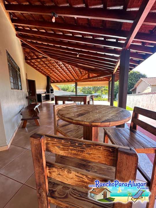 Varanda ampla com mesa de sinuca e uma área para churrasco, equipada com churrasqueira de alvenaria, pia, mesas e cadeiras.